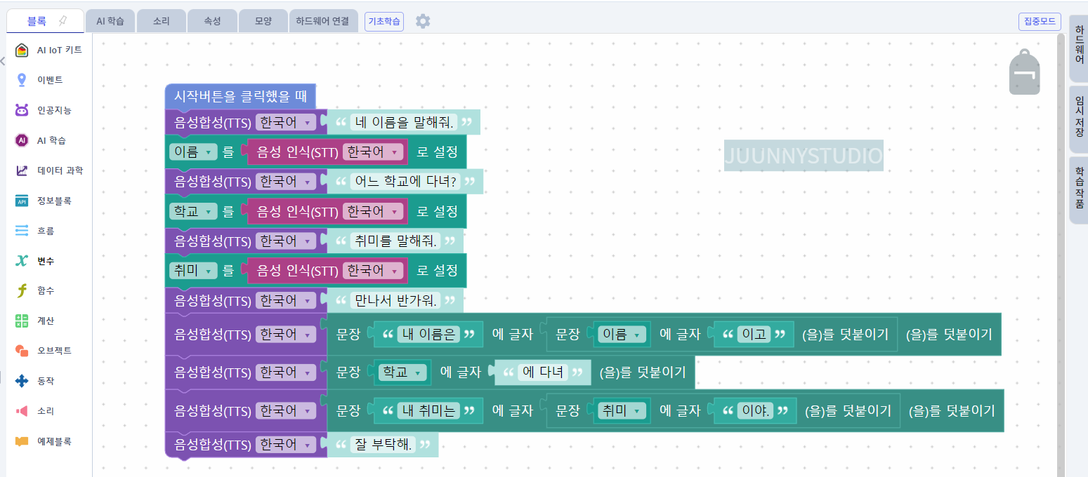 | AI 블록코딩 시작하기 - 예제 블록 살펴보기 (0) | 2024.06.14 |
