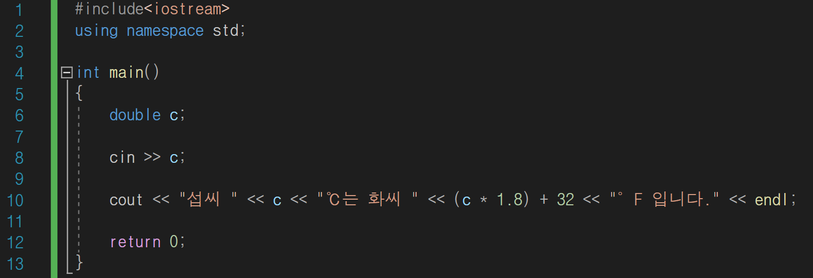 섭씨를 자료형 double, 즉 실수로 받아, 계산식을 거쳐 화씨로 변환하는 내용이다. 화씨 역시 double형인데, 굳이 2번 자료형을 선언하지 않았다. 왜냐하면 섭씨의 자료형의 결과가 화씨이고, 섭씨의 double형이 결과에 그대로 가기 때문이다.