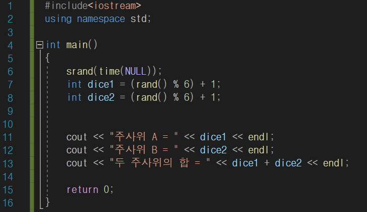 주사위 2개를 던져 게임판을 이동한 후 아이템을 얻는 게임이 있다. 주사위 게임은 현실에서도, 게임 내에서도 어떤 결과가 나올지 모르는 운이라 생각하다가 코드로 짜 보면 어떨까 싶어 한번 해보았다. 다음은 주사위 2개를 랜던으로 던져 두 주사위의 합을 구하는 코딩이다.