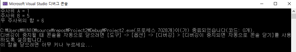 주사위 1,2를 정수형으로 선언하고, 6개의 숫자 중에서 랜덤으로 나오게 설정하였다. 그리고, 랜덤으로 나온 수를 출력하고, 그 합도 출력하는 간단한 코딩이다. 컴파일하면 아래와 같이 나오는데, 이 결과는 수많은 랜덤 결과 중의 하나로, 재 컴파일하면 다른 결과를, 매번 할 때마다 다른 결과를 얻게 될 것이다.
