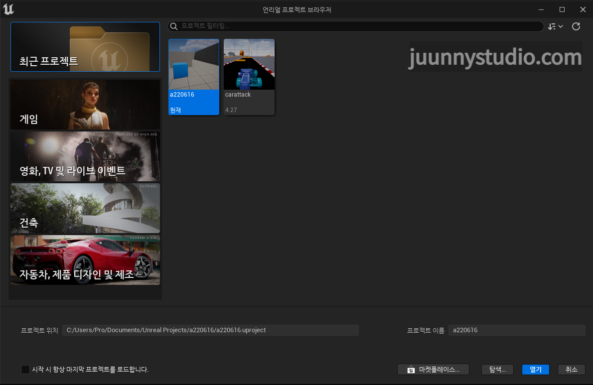 잊지 말아야 할 것은 선택후, 프로젝트가 저장될 위치를 설정하고, 프로젝트 이름을 정하는 일이다. 프로젝트 위치 설정이 중요한 이유는 그곳에 앞으로 프로젝트와 관련된 모든 작업 파일이 차곡차곡 쌓이기 때문이다. 드라이브 여러 개를 기존에 사용하고 있다면 용량이 넉넉한 쪽에다 저장하는 걸 추천한다. 프로젝트 작업을 하다 보면 에셋을 사용하기도 하고, 음향 파일을 넣기도 하면서 데이터와 작업량이 쌓이고, 연관된 파일이 생성되기 때문이다.