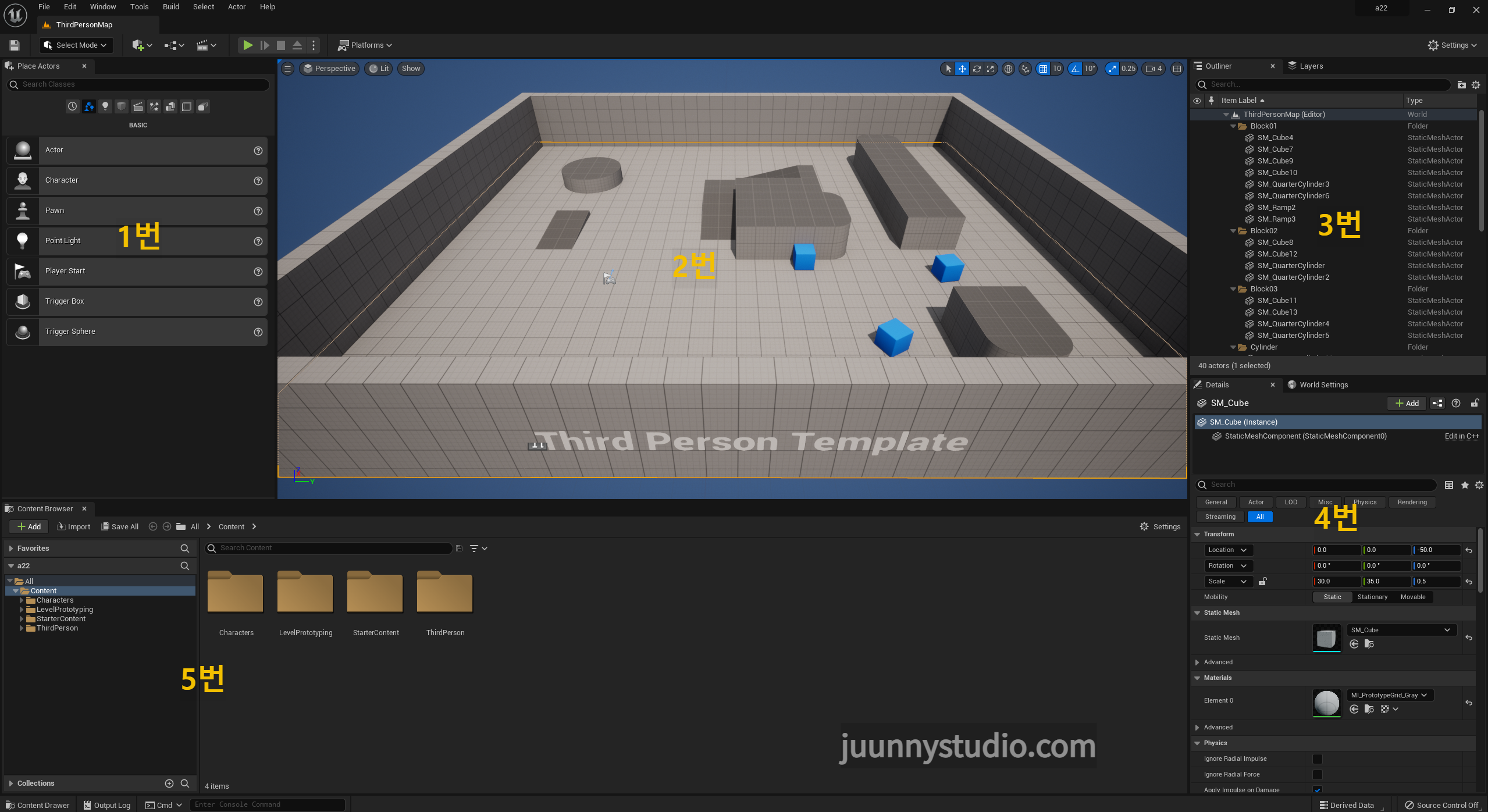 1번은 모드(Mode) 창이다. Place Actor 클래스를 선택하여 배치할 수 있다.