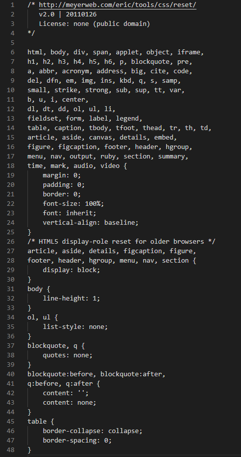 다음은 HTML, CSS, 웹 표준 전문가인 에릭 마이어(Eric A. Meyer)의 CSS초기화 내용이다.