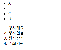 ul 태그와 ol 태그와 비교해보면 잘 알 수 있다. ul 태그는 un-ordered list의 약자로 순서가 없는 리스트며, ol 태그는 ordered list의 약자로 순서가 있는 리스트이다. 다음과 같이 작성 후 결과를 살펴보자.