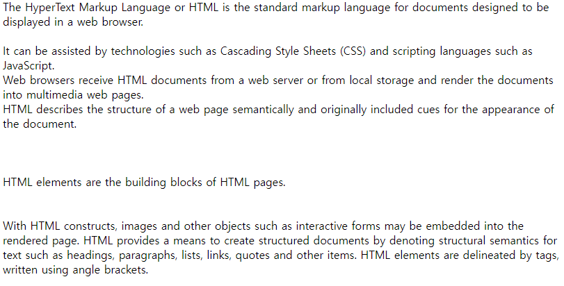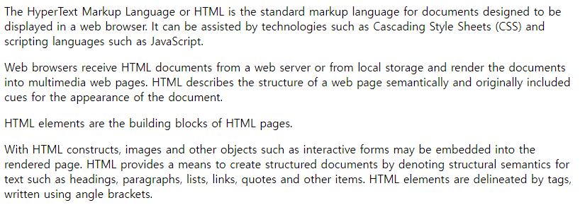 글을 쓸 때 들여 쓰기를 통해 단락을 나누어 내용을 구분하는 것처럼 html에서 p태그를 사용하면 단락을 표현할 수 있다. 아래는 html를 설명하는 위키피디아의 설명으로 단락을 구분해보고자 가져왔다.
