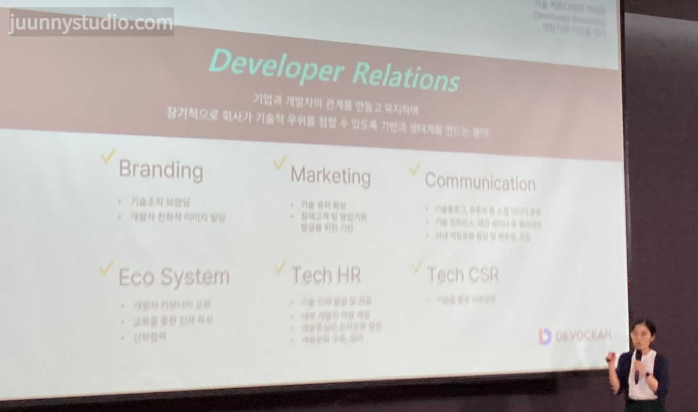 첫번째 마이크를 잡은 우아한 형제들의 DevRel 조은옥님. DevRel의 개념과 사례, 기술 커뮤니티에 대한 그리고 DevRel의 전망 등에 대해 나누어주셨다. 개인적으로 굉장히 흥미로웠던 부분이고, 이전에 몰랐던 개념을 알게 되는 시간이었다.