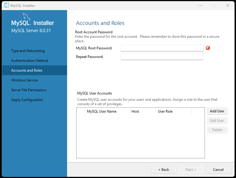 거의 마지막쯤 Root Password를 설정하는 게 뜬다. 관리자 비밀번호를 설정하는 건데 보안성 있게 설정한다. 하단에 User를 추가해서 User별 접근 범위를 설정할 수도 있다.