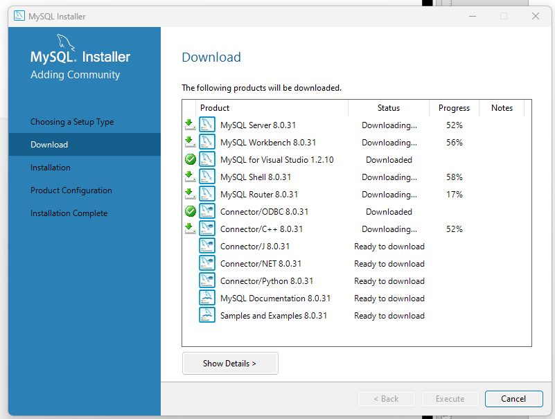 다음과 같은 창이 나오며 순서대로 다운로드가 진행된다. 중간중간 다 되면 Execute를 눌러 다음 단계로 이동한다.