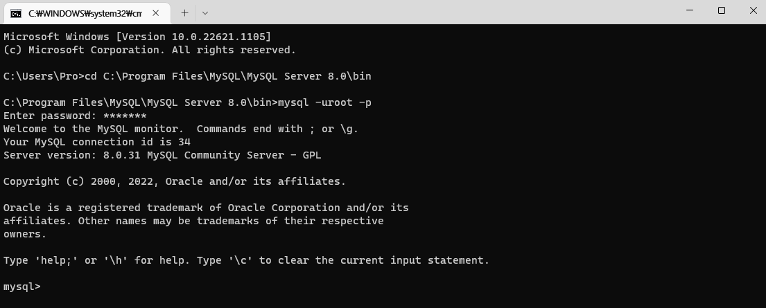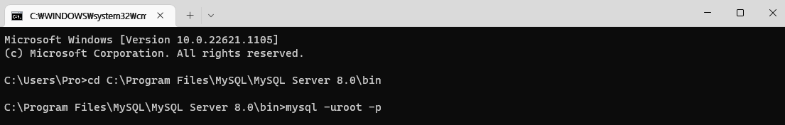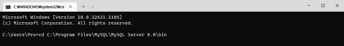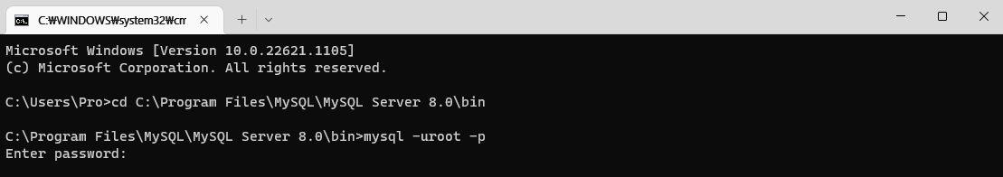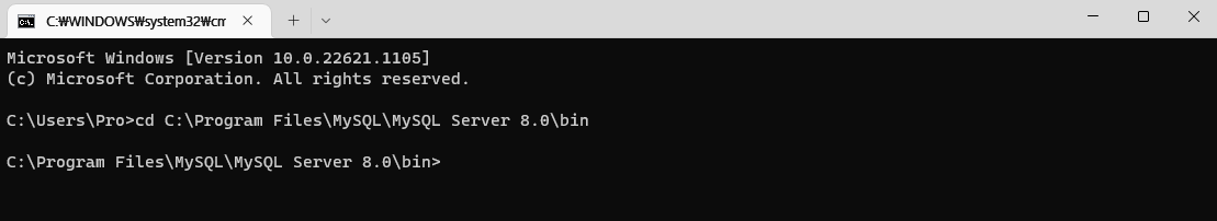 cd C:\Program Files\MySQL\MySQL Server 8.0\bin(각자 컴퓨터에서의 mysql이 설치된 위치 경로)를 입력한다.