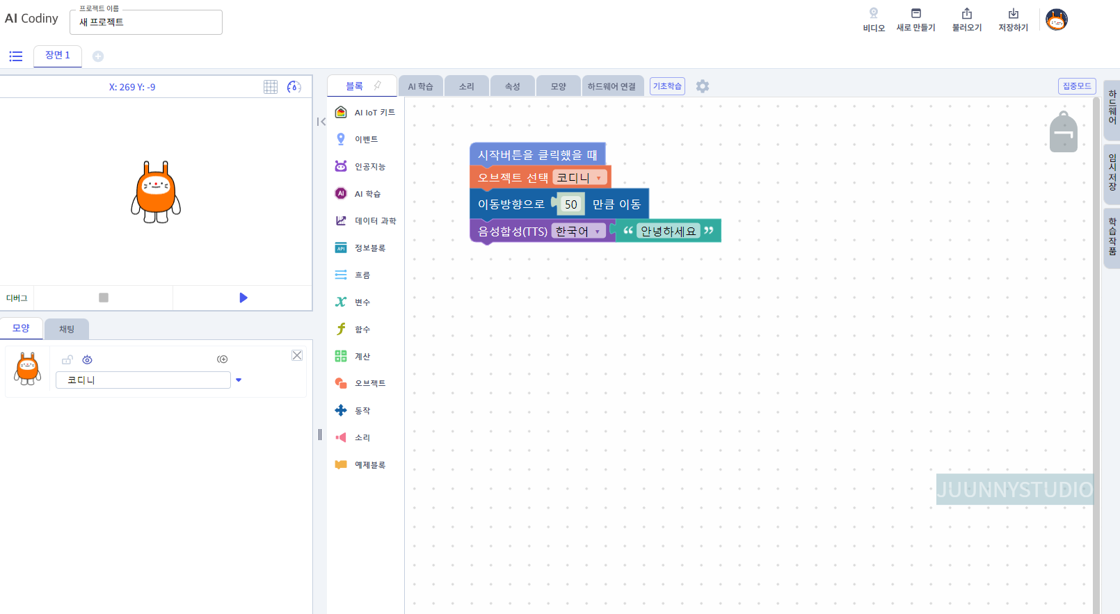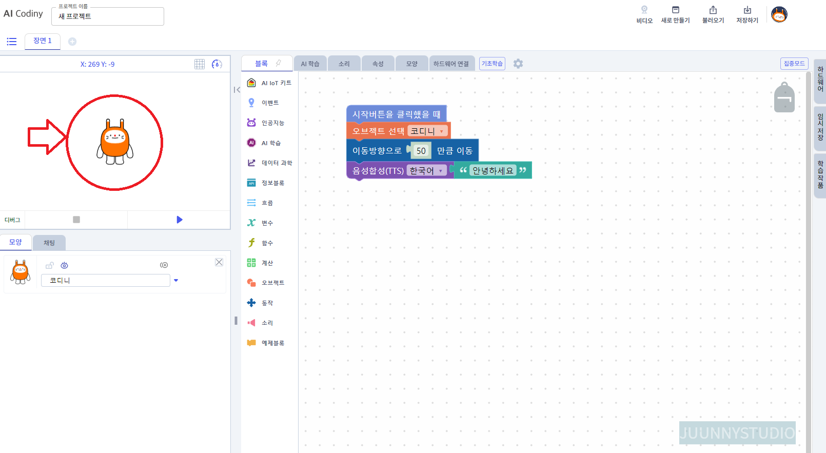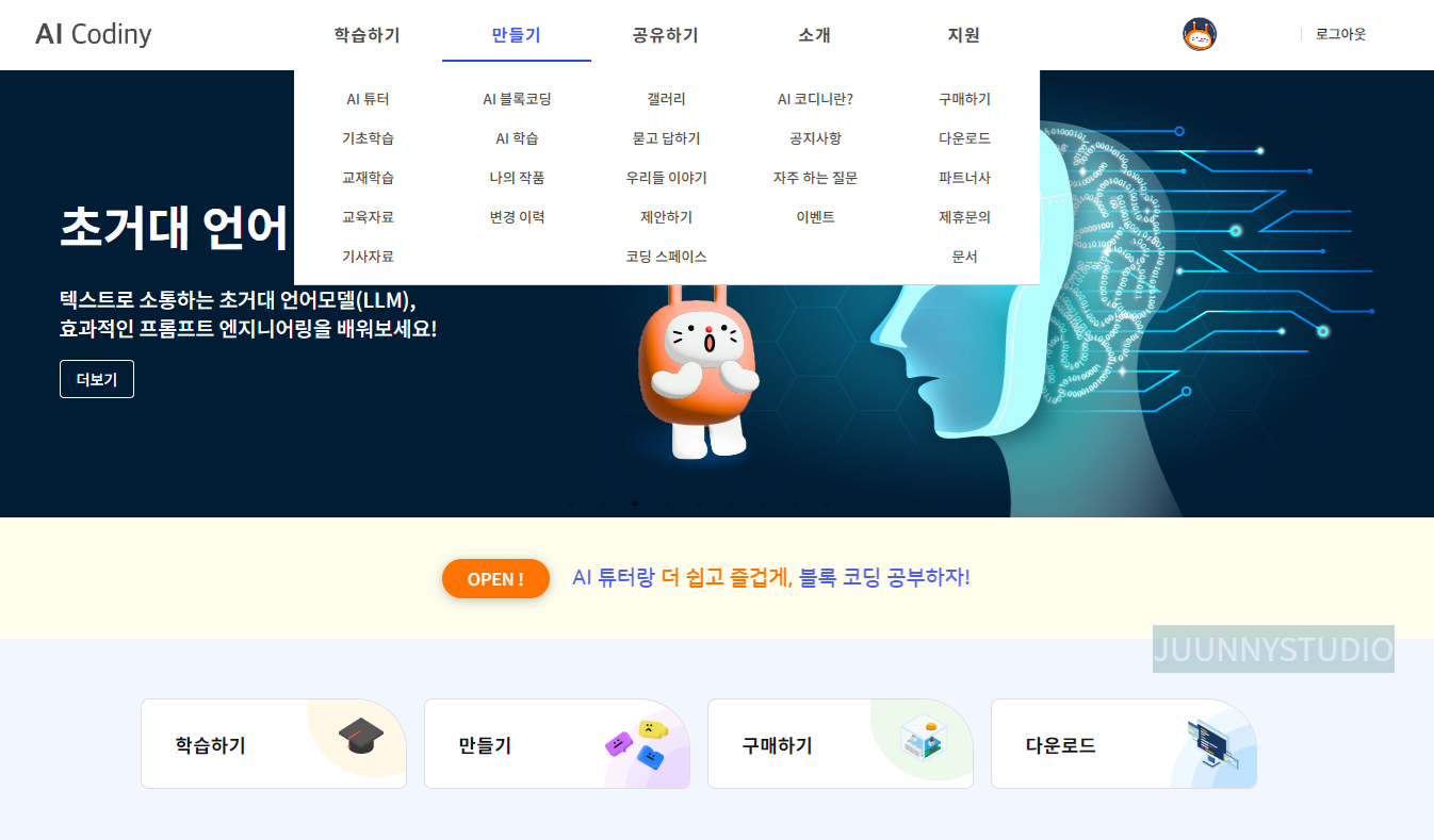 메뉴에서 만들기 -> AI 블록코딩을 클릭합니다.