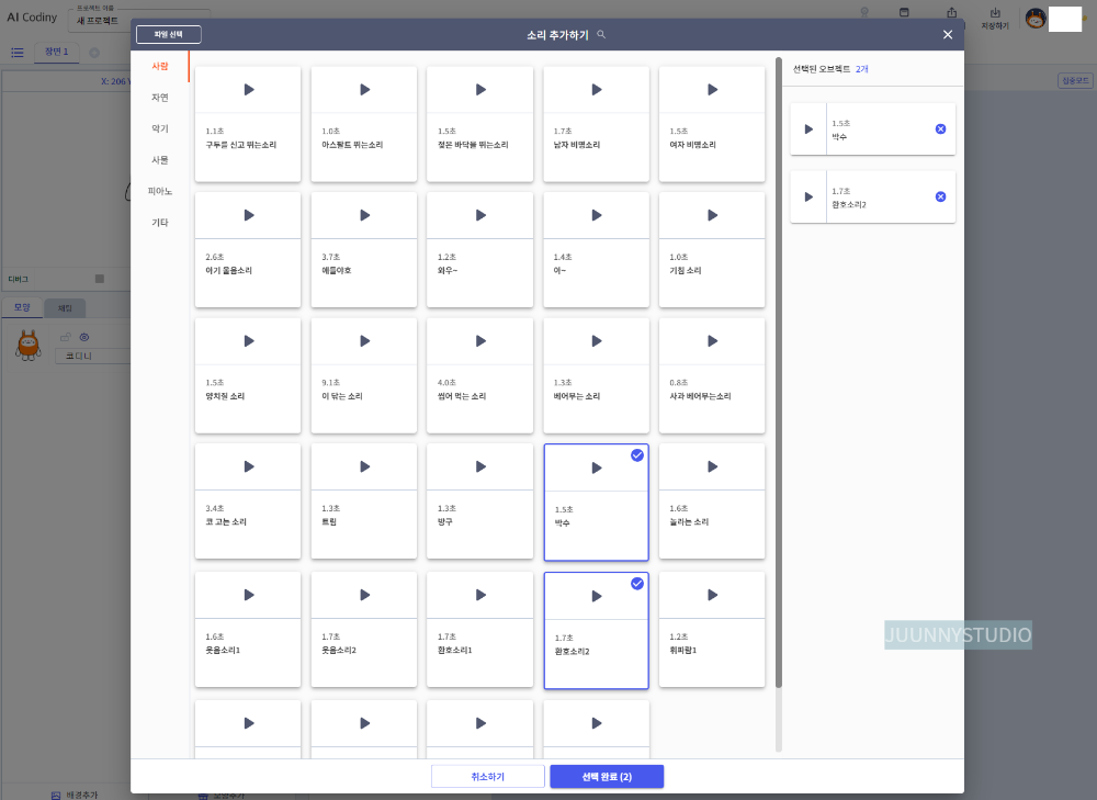 그러면 소리탭에 선택했던 박수소리와 환호소리2가 추가된 것을 확인할 수 있습니다.