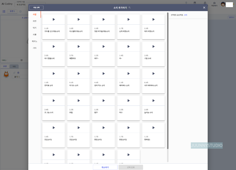 좌측에 사람, 자연, 악기, 사물, 피아노, 기타 등 여러 종류의 소리가 있는데 각각 눌러서 어떤 소리가 있는지 확인하고 골라보세요!
