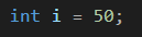 지금 보는 코드는 변수를 초기화한 모습이다. 변수를 초기화한다는 건 프로그램 시작에 앞서 초기의 값을 정하는 걸 의미한다. 여기서 int는 자료형 이름으로 여기서는 정수를 나타내고, i는 변수의 이름이다. 따라서 이 코드는 정수형 i를 선언하는데, 그 i는 50을 저장하고 있다는 의미를 가지고 있다. 한편, 변수 선언과 동시에 초기화를 다음과 같이 할 수 있다.