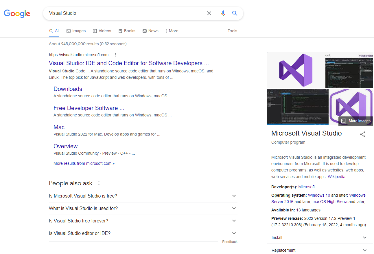 구글에 Visual Studio라고 검색하면 가장 상단에 공식 사이트가 소개되어 나타난다.