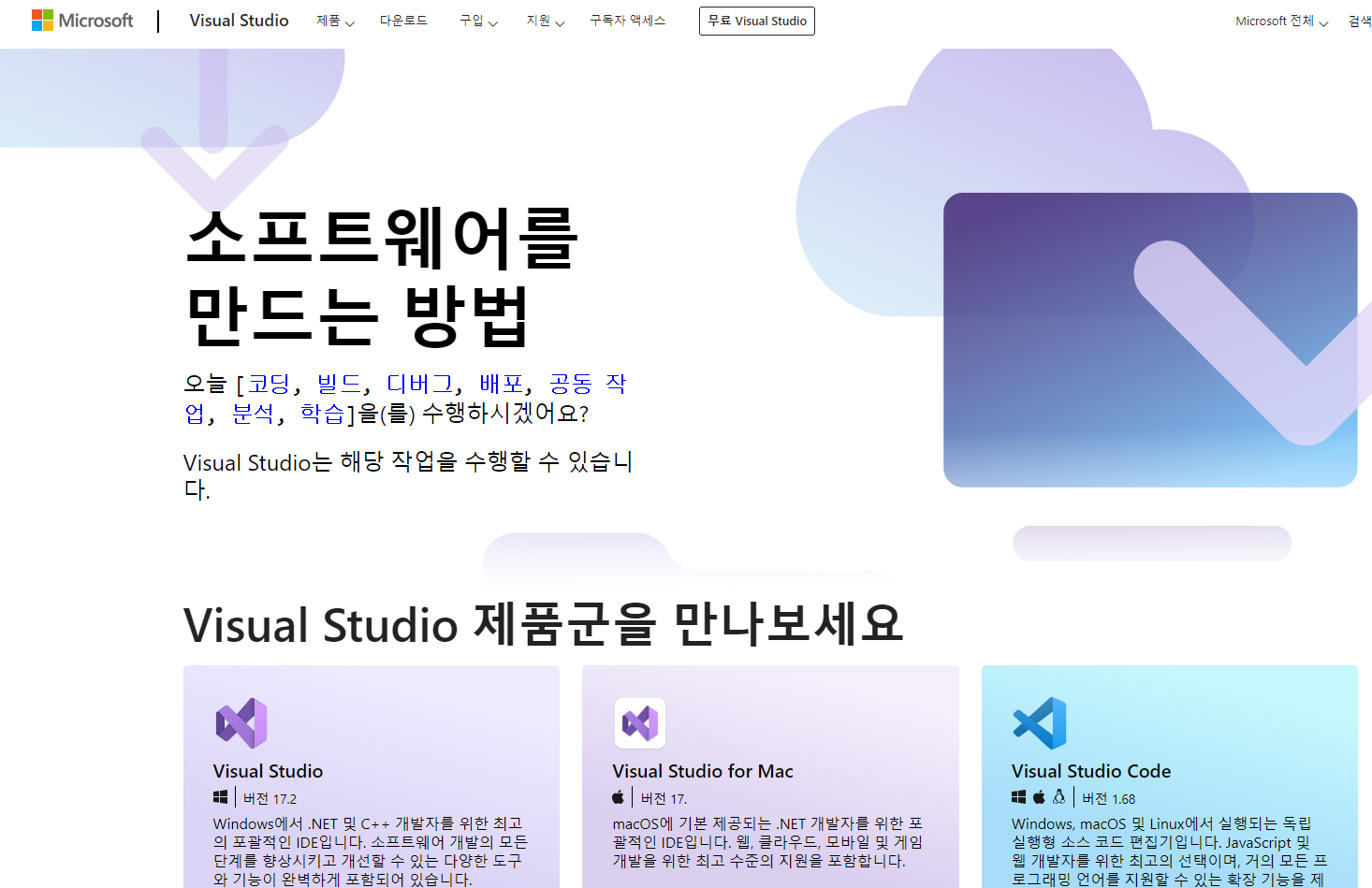 Visual Studio 공식 홈페이지에 들어가면 다음과 같은 화면을 마주하게 된다.